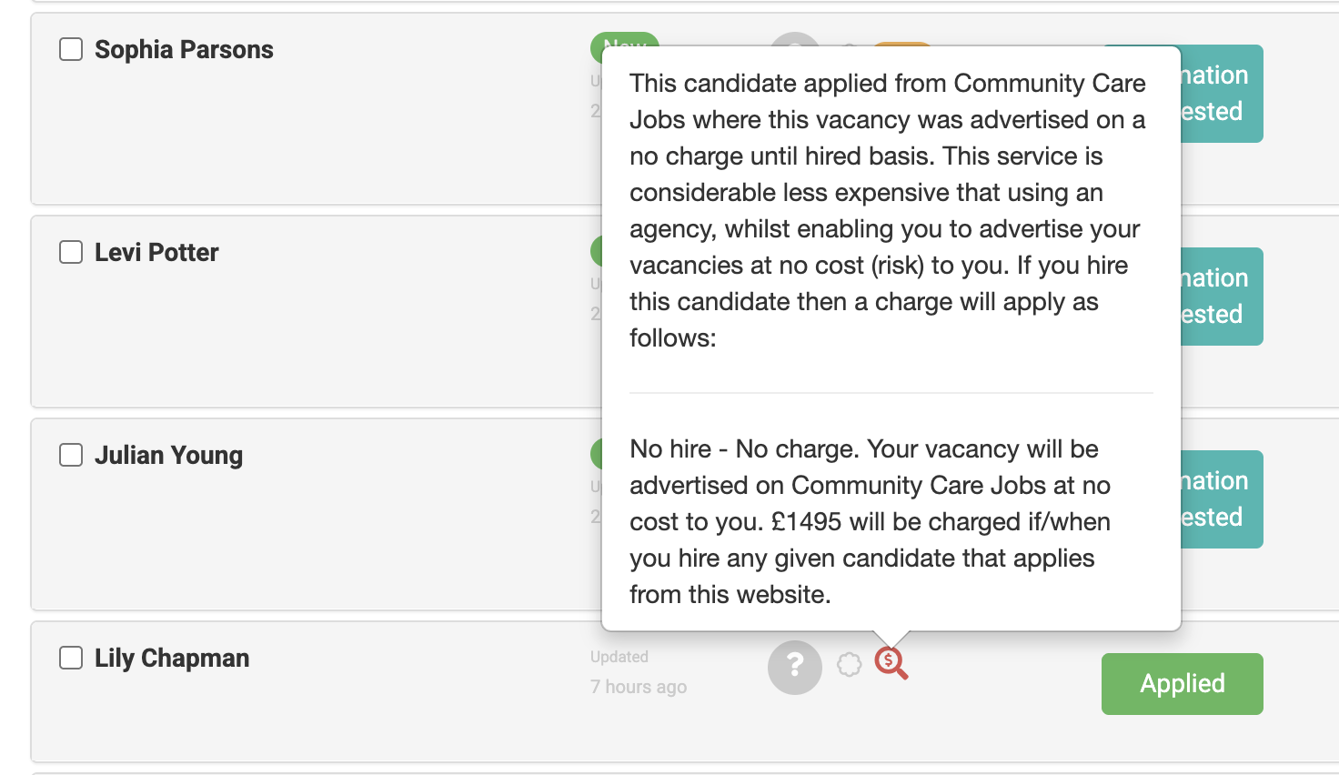 - Candidates who applied via Community Care Jobs are clearly identified (see below).